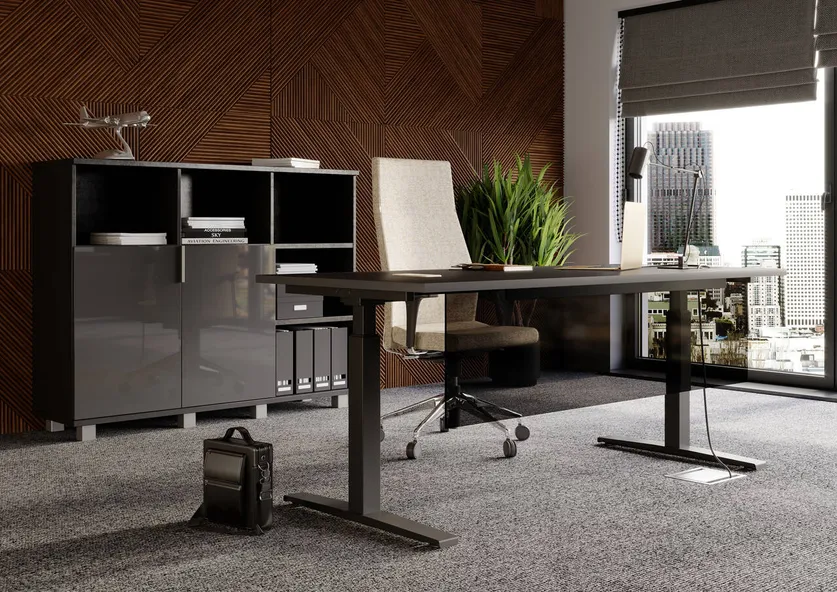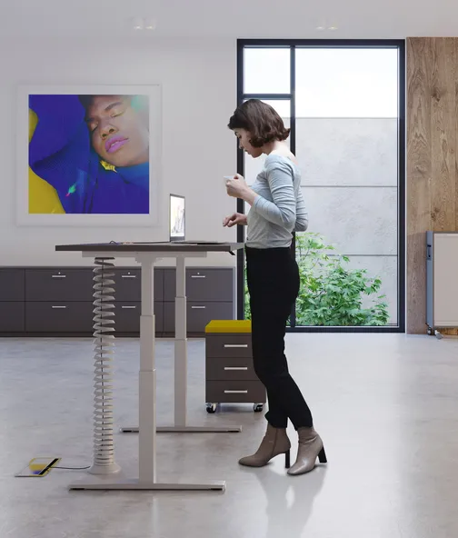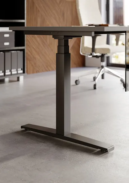 The frame is electrically adjustable from 650 to 1290 mm and powder-coated.