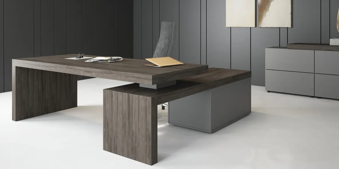 Biurko AUTTICA stanowi mocną konstrukcję składającą się z dwóch blatów zestawionych ze sobą