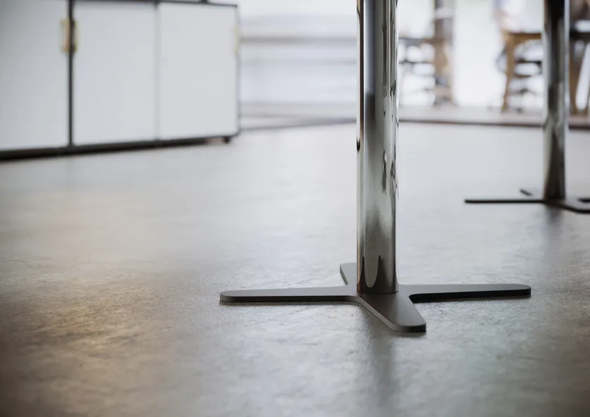 - Stół oparty na nogach - podstawa krzyżakowa wykonana ze stali, wycięta laserowo o grubości 10mm, długość ramienia w najdłuższym miejscu = 600mm