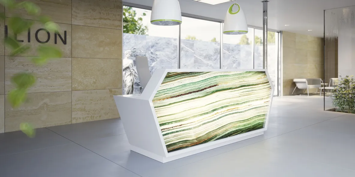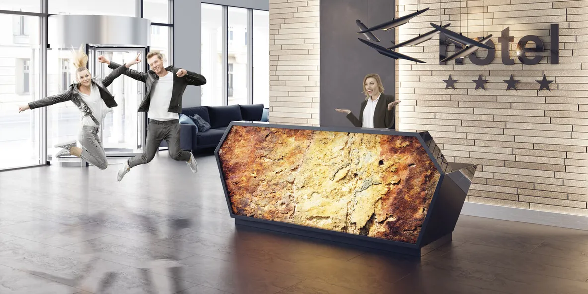 Front lady zbudowano na planie heksagonu, formy uważanej za doskonałą. W ramę z płyty wkomponowano taflę hartowanego szkła, którą rozświetlają lampy ledowe. Szkło zdobi wysokojakościowy nadruk wykonany techniką cyfrową.