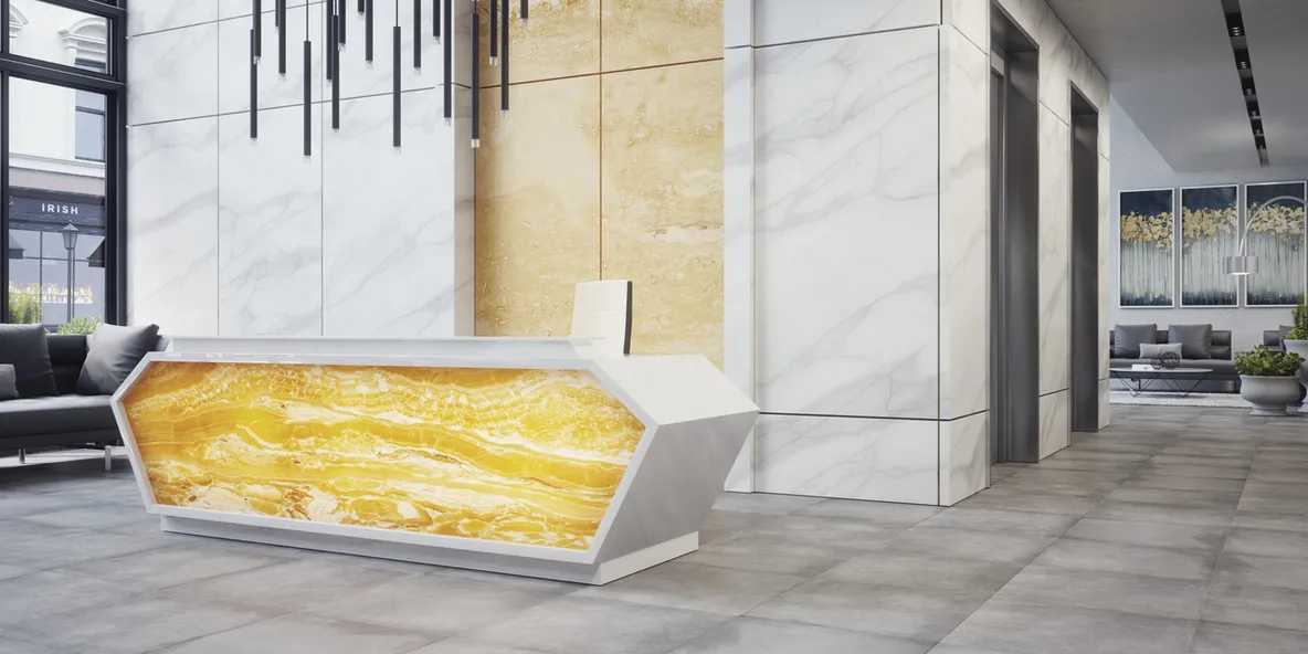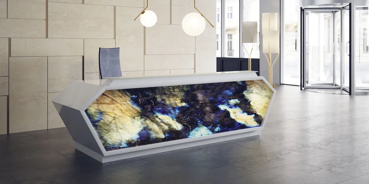 Lada recepcyjna DIAMOND to nowoczesny i elegancki mebel do biura, który łączy funkcjonalność z efektownym designem. Charakteryzuje się frontem ze szkła hartowanego z nadrukiem UV, podświetlanym LED, oraz korpusem z lakierowanej płyty MDF.