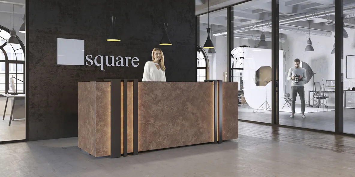 - Front i boki zewnętrzne lady pokryte powłoką strukturalną – dostępna kolorystyka rdza, miedź, beton (powłoka nakładana na powierzchnię płyty ręcznie, struktura i kolor są niejednolite i niepowtarzalne)