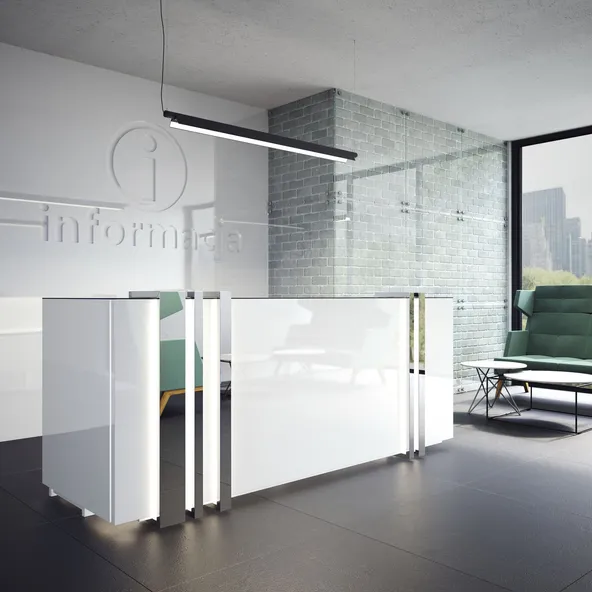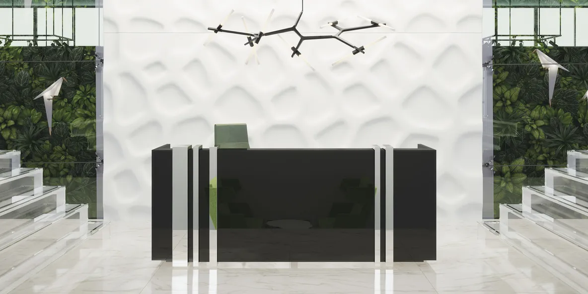 - Zwarta bryła lady ozdobiona pionowymi klamrami z chromowanego metalu – nadaje recepcji elegancji i nowoczesnego charakteru