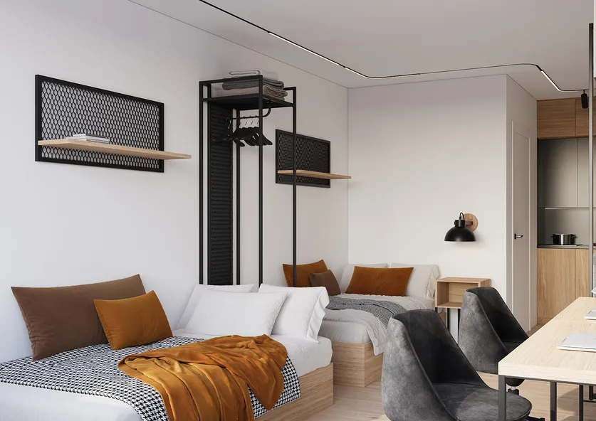 Na początku współpracy analizowane są wymagania inwestora, projektanta lub operatora obiektu – m.in. liczba pokoi, funkcje przestrzeni wspólnych (kuchnie, strefy wypoczynku, pralnie), przewidywana intensywność użytkowania oraz wytyczne wizualne. Na tej podstawie powstaje koncepcja układu funkcjonalnego i pierwsze wizualizacje.
