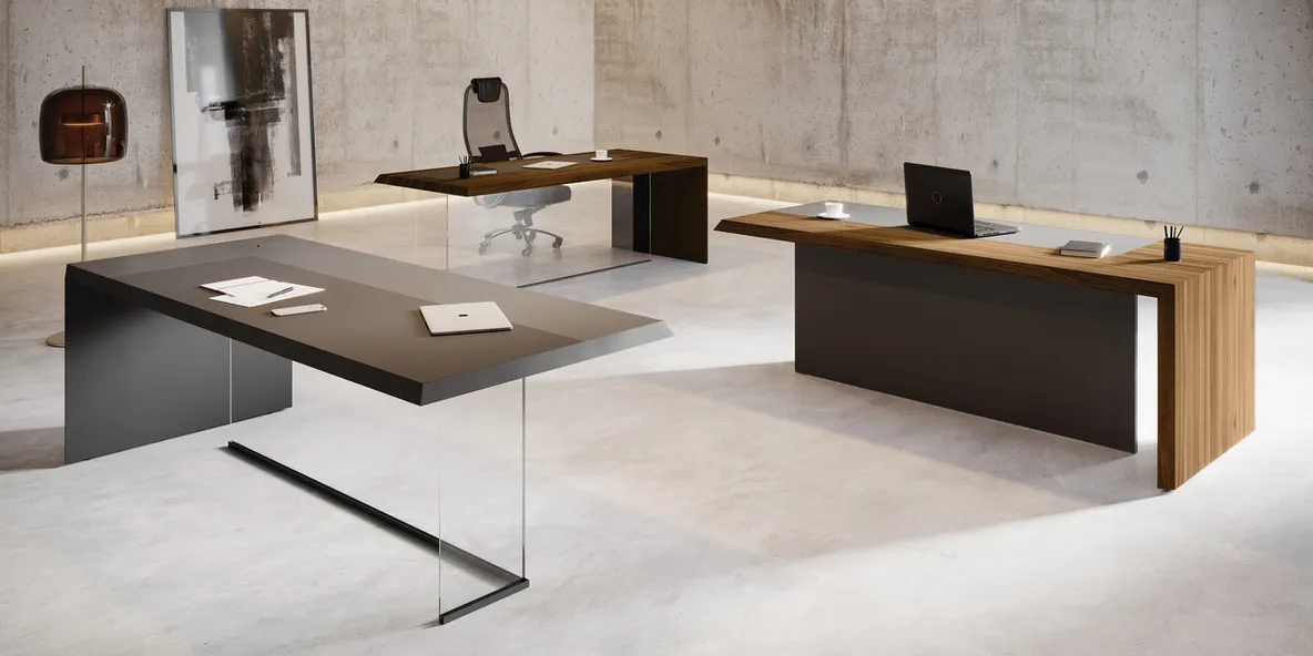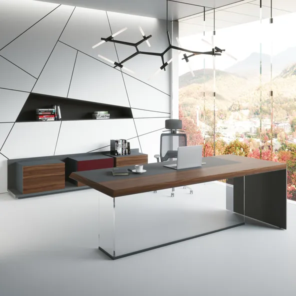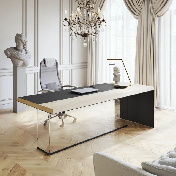 - Masywny, pogrubiony blat biurka optycznie unosi się dzięki przezroczystej tafli hartowanego szkła lub na nodze wykończonej płytą melaminowanej