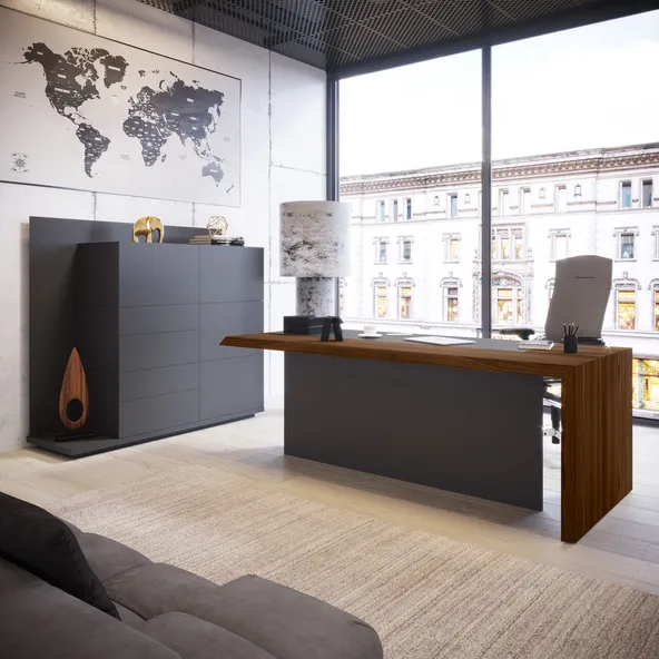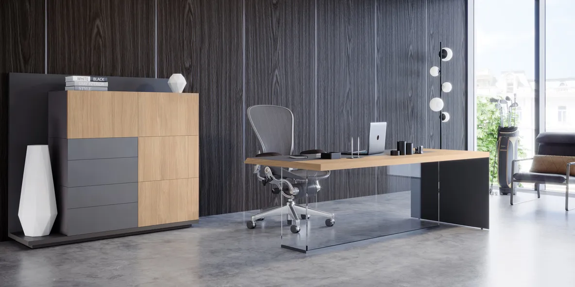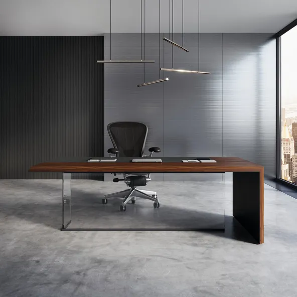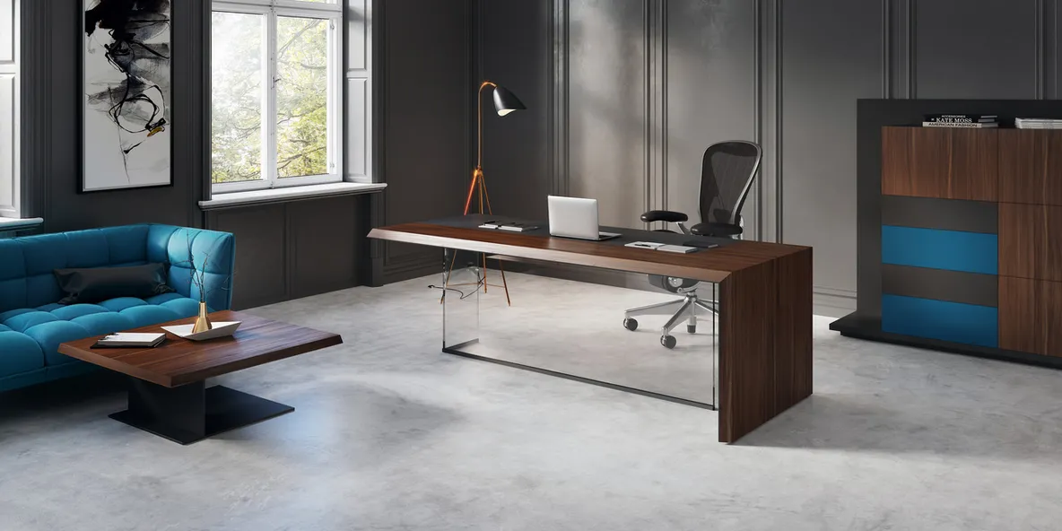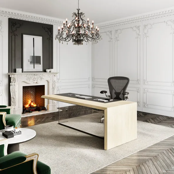 SORENO to eleganckie biurko gabinetowe stworzone z myślą o wymagających użytkownikach. Gruby blat z płyty melaminowanej sprawia wrażenie zawieszonego w powietrzu, a jego stabilność zapewnia efektowna noga z hartowanego szkła. To połączenie solidności z lekkością formy nadaje meblowi wyjątkowy, nowoczesny charakter. Doskonały wybór dla osób ceniących wyrafinowany design, wysoką jakość materiałów i prestiżowe wykończenie gabinetu.