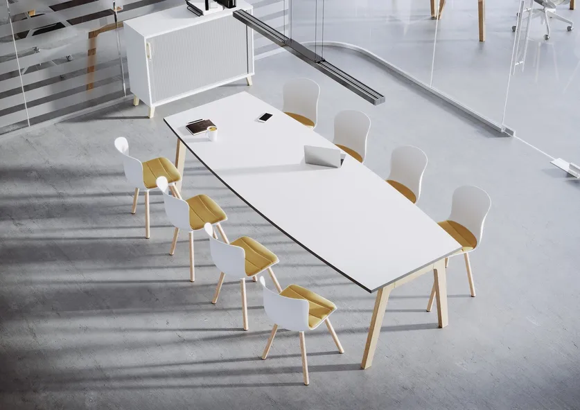 Stylowe i funkcjonalne rozwiązanie do sal spotkań i przestrzeni biurowych. Opiera się na eleganckich, drewnianych nogach i oferuje duży wybór kolorów blatów, łącząc nowoczesny design z naturalną estetyką. Idealny do tworzenia profesjonalnego, a zarazem przyjaznego środowiska pracy.