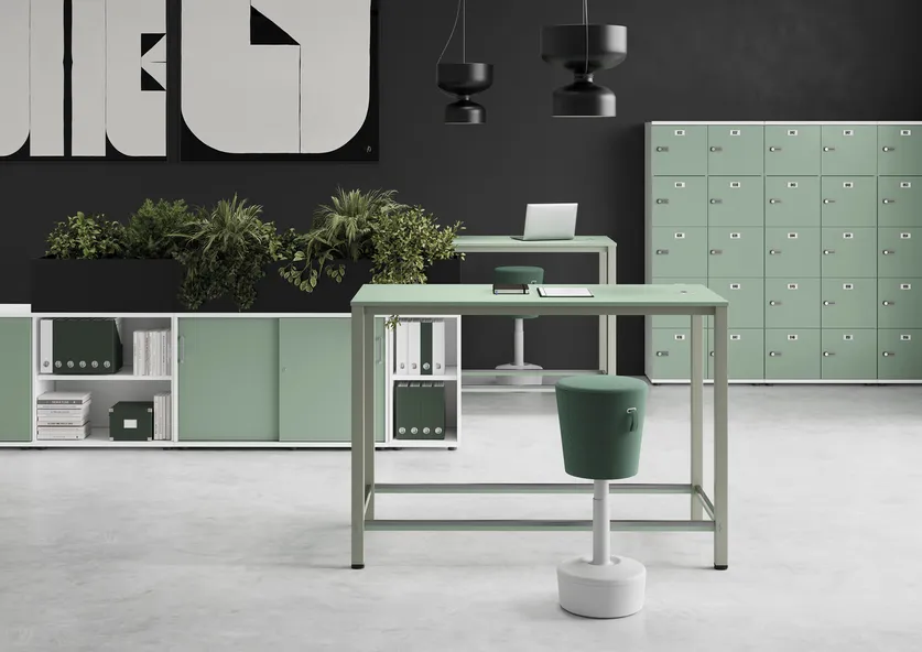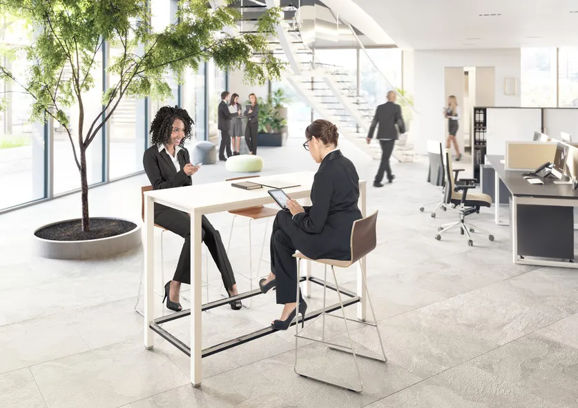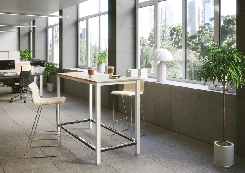 - Przeznaczony do spotkań na stojąco lub przy hokerach – świetny do szybkich narad, stref coworkingowych czy eventów