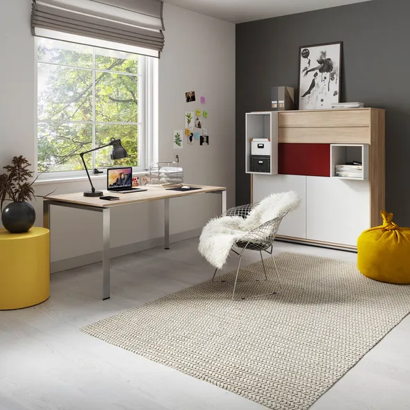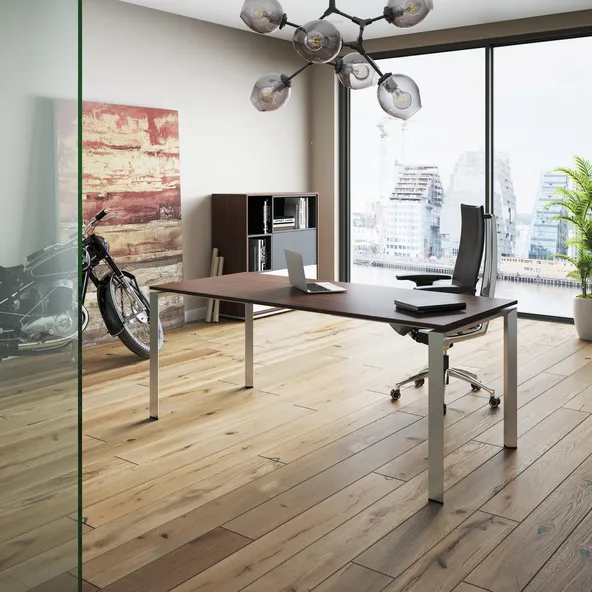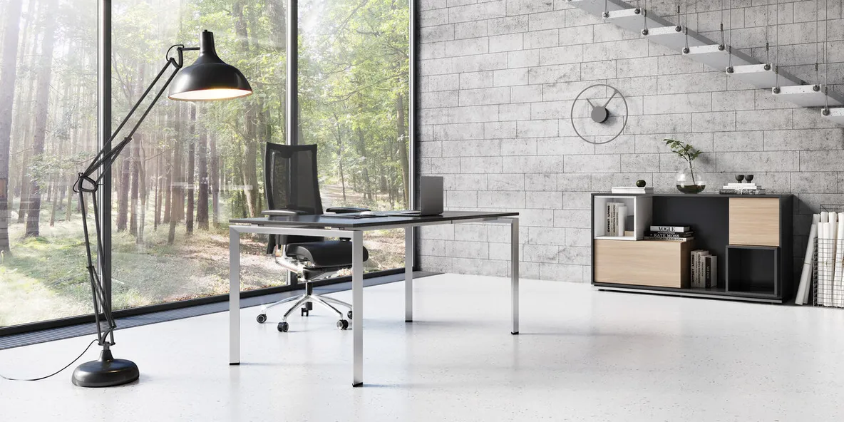 - Lekki, stosunkowo cienki blat biurka wspierany się na mocnych, metalowych stelażach