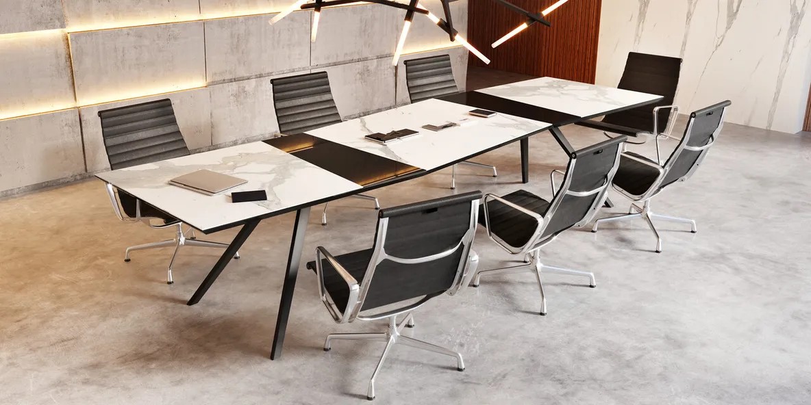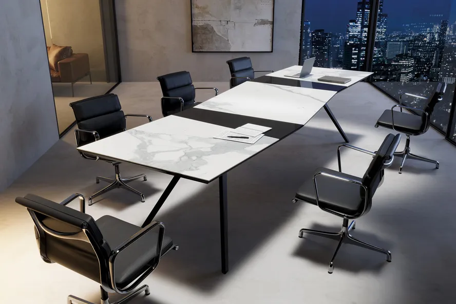 Stół konferencyjny VIND łączy nowoczesny, geometryczny design z najwyższą jakością wykonania. Posiada blat wykonany ze spieku kwarcowego, co zapewnia trwałość i prestiżowy wygląd. Solidne, metalowe nogi malowane proszkowo nadają konstrukcji lekkość i stabilność. Prosta forma i subtelne detale sprawiają, że stół doskonale wpisuje się w eleganckie, reprezentacyjne gabinety i sale konferencyjne.