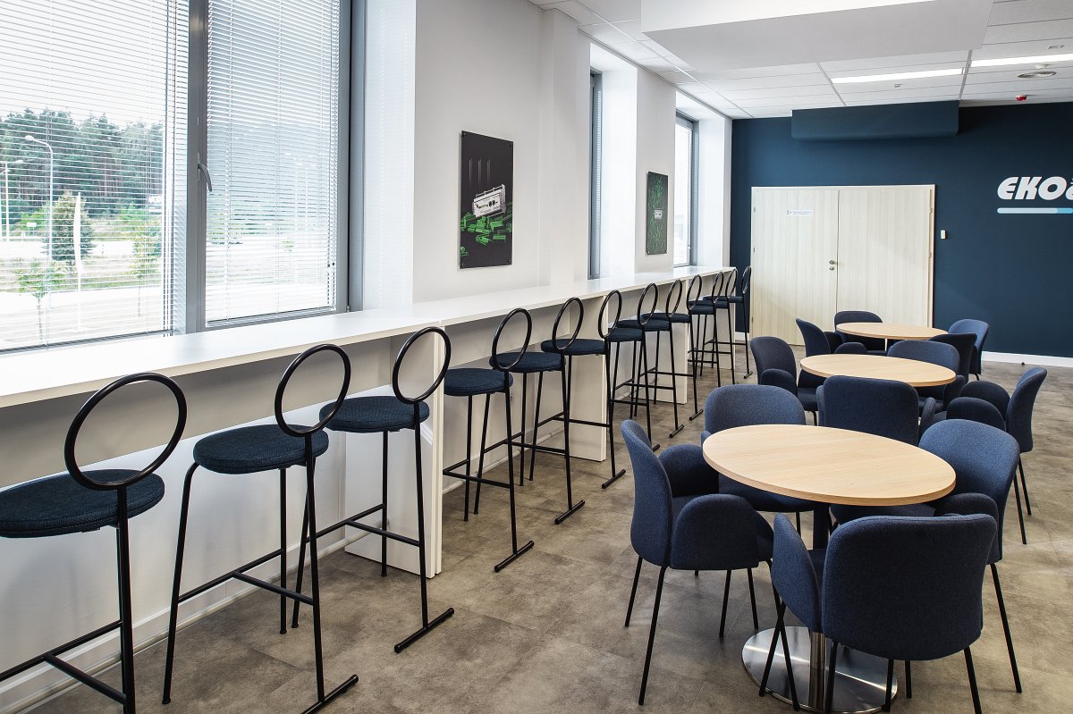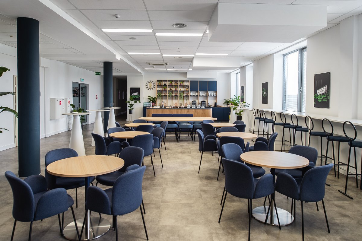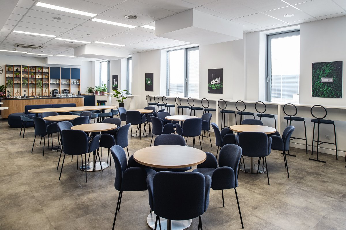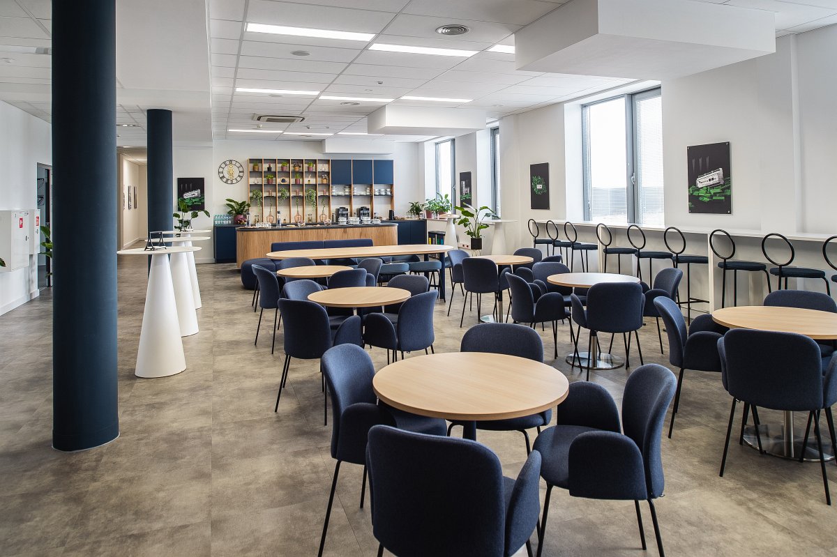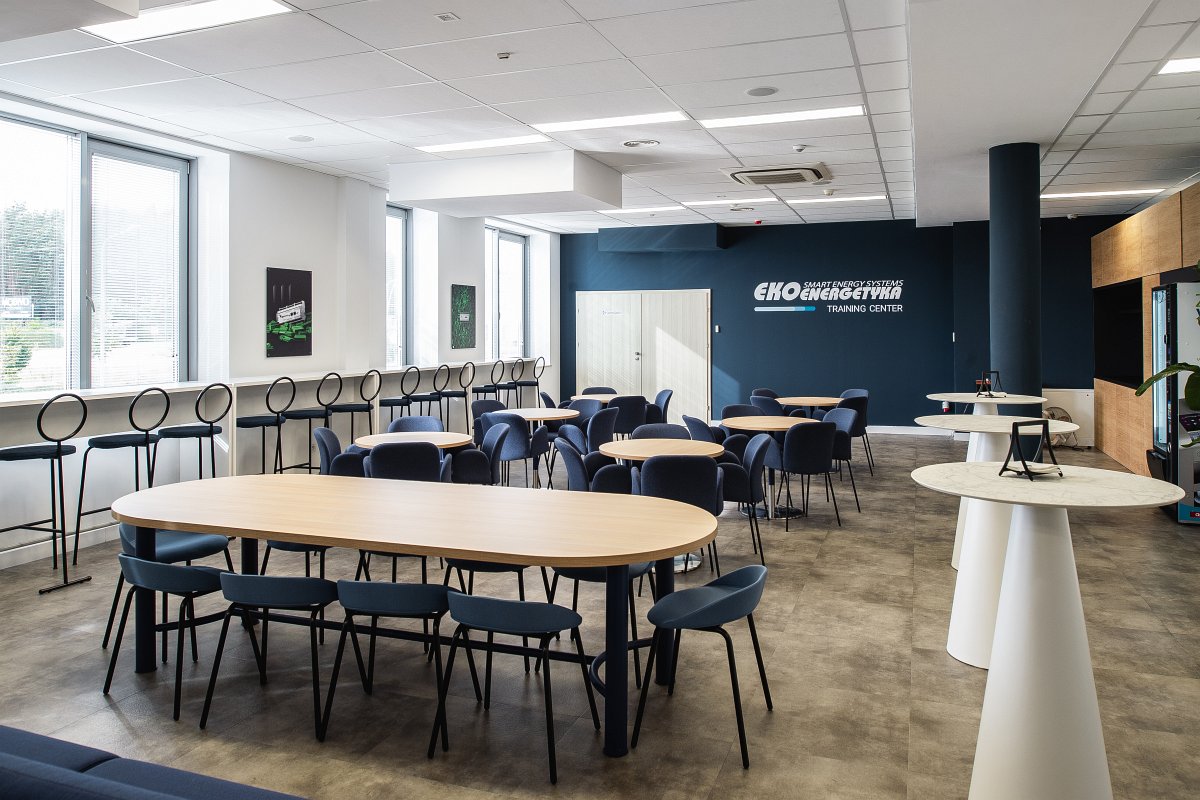 Części wspólne zostały zaprojektowane nie tylko z myślą o reprezentacyjności, ale przede wszystkim o integracji uczestników szkoleń. Duży cafe point z wyspą, który pomieści jednocześnie kilkanaście osób, stanowi centralne miejsce do spotkań i relaksu. Dodatkowo, przestrzeń została wzbogacona o meble wypoczynkowe, które zapewniają komfort i pozwalają każdemu znaleźć idealne miejsce do odpoczynku.