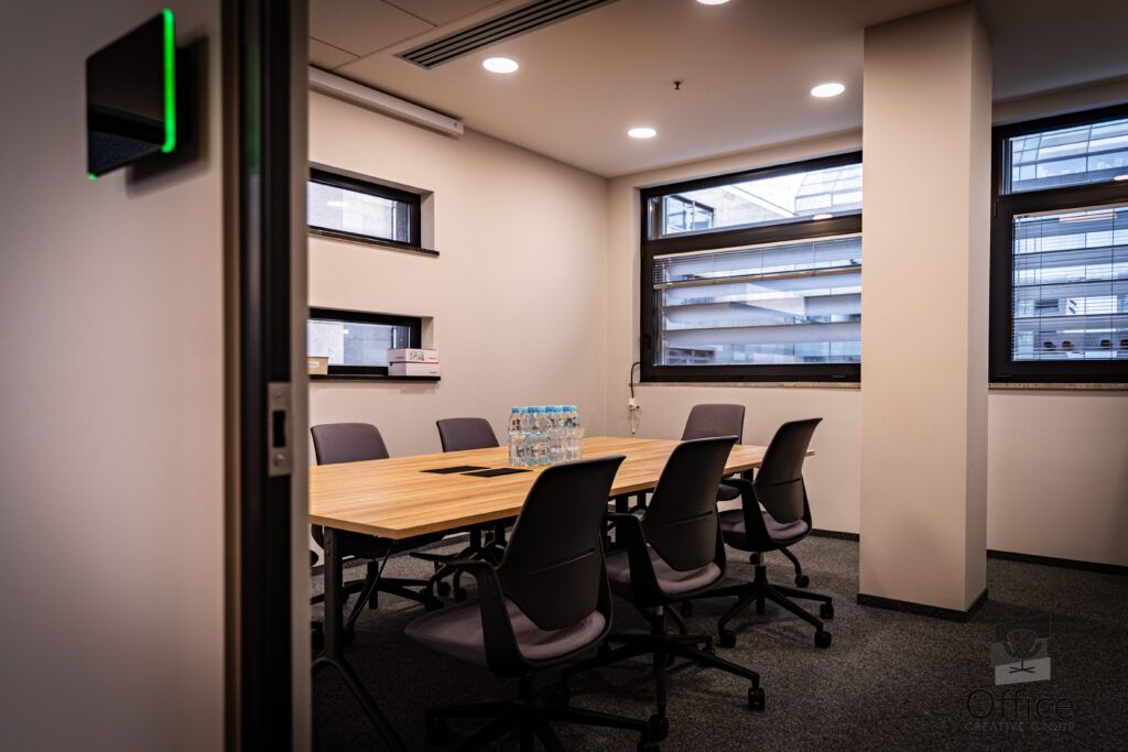 - Powierzchnia konferencyjna: Dostarczyliśmy panele akustyczne, które zapewniają odpowiednie warunki do prowadzenia spotkań i prezentacji oraz krzesła tapicerowane, meble biurowe dostępne były od ręki.