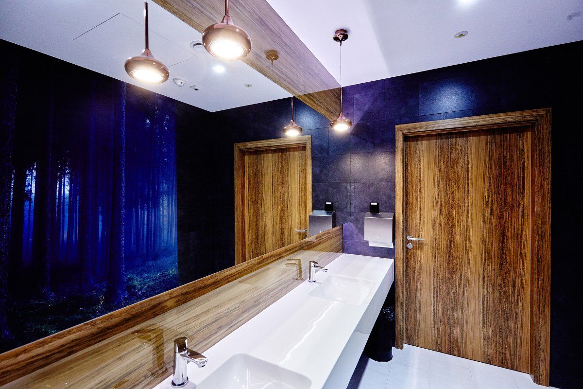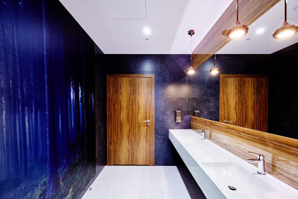 Do aranżacji użyliśmy luksusowych materiałów: wysokiej jakości wykładzin, welurowych zasłon, szklanych paneli oraz egzotycznego drewna, tworząc elegancką,